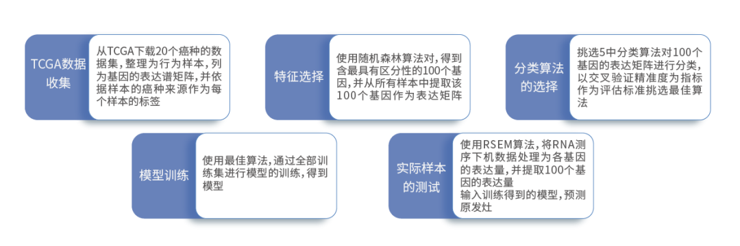 通过以2000个决策树桩组成的随机森林模型,使用所有20501个基因对TCGA数据集进行交叉验证,研究人员得到最终的溯源准确率为95%。使用随机森林算法对每个基因的重要性进行评估并排序后,将基因精简至100个最重要的基因列表。通过仅使用这100个基因,重复了交叉验证,得到的各癌种平均精准度为95%。