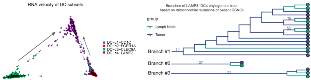 图2 左图:将肝癌组织中树突状细胞的RNA velocity的计算结果投射到在Diffusion Map坐标上,颜色代表不同的细胞群。右图:基于线粒体基因突变构建的LAMP3+ DC进化树