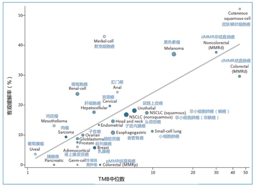 肿瘤突变负荷(TMB)是免疫治疗中应用最多的分子标志物之一。2017年《新英格兰杂志》发表的27种癌症的TMB与应用PD-1/PD-L1抑制剂治疗有效率的分析显示:各大常见肿瘤接收PD-1抑制剂治疗的有效率和TMB大小几乎呈线性关系(如图2),即TMB越高,PD-1抑制剂有效性越高。[1]