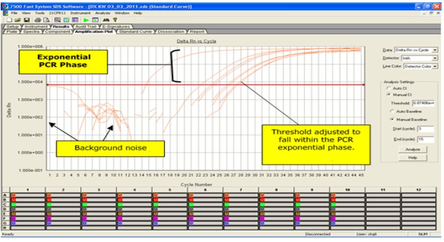 Threshold adjusted to fall within the PCR exponential phase.:阈值设定在PCR指数增长期内。
