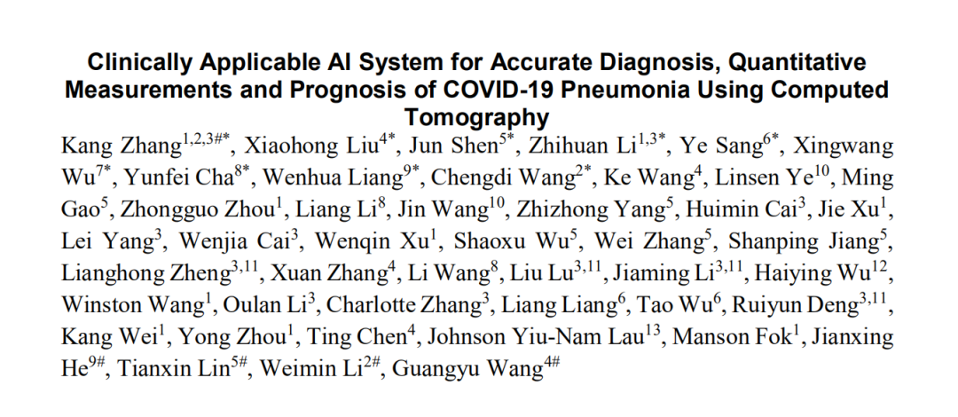 2020年4月25日,相关研究成果的预校样(pre-proof)论文在线发表于国际顶级学术期刊《细胞》(Cell),论文题为“Clinically Applicable AI System for Accurate Diagnosis, Quantitative Measurements and Prognosis of COVID-19 Pneumonia Using Computed Tomography”。论文通讯作者为澳门科技大学医学院张康、清华大学计算机科学与技术系王光宇、中山大学孙逸仙纪念医院林天歆、广州医科大学第一附属医院何健行、四川大学华西医院李为民。此外,该AI系统已在全球范围内免费公开,以协助临床医生应对COVID-19。