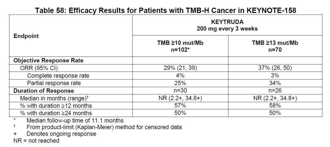 本次TMB作为伴随诊断标志物获批主要依据Pembrolizumab在多癌种中开展的Keynote-158研究。该研究纳入的患者按疾病类型包括小细胞肺癌、宫颈癌、子宫内膜癌、肛门癌、阴道癌、神经内分泌瘤、唾液腺癌、甲状腺癌、间皮瘤以及胆道癌共10个癌种,入组人群大多都经历过至少一次的系统治疗,主要研究终点为经独立评审委员会评估的ORR。