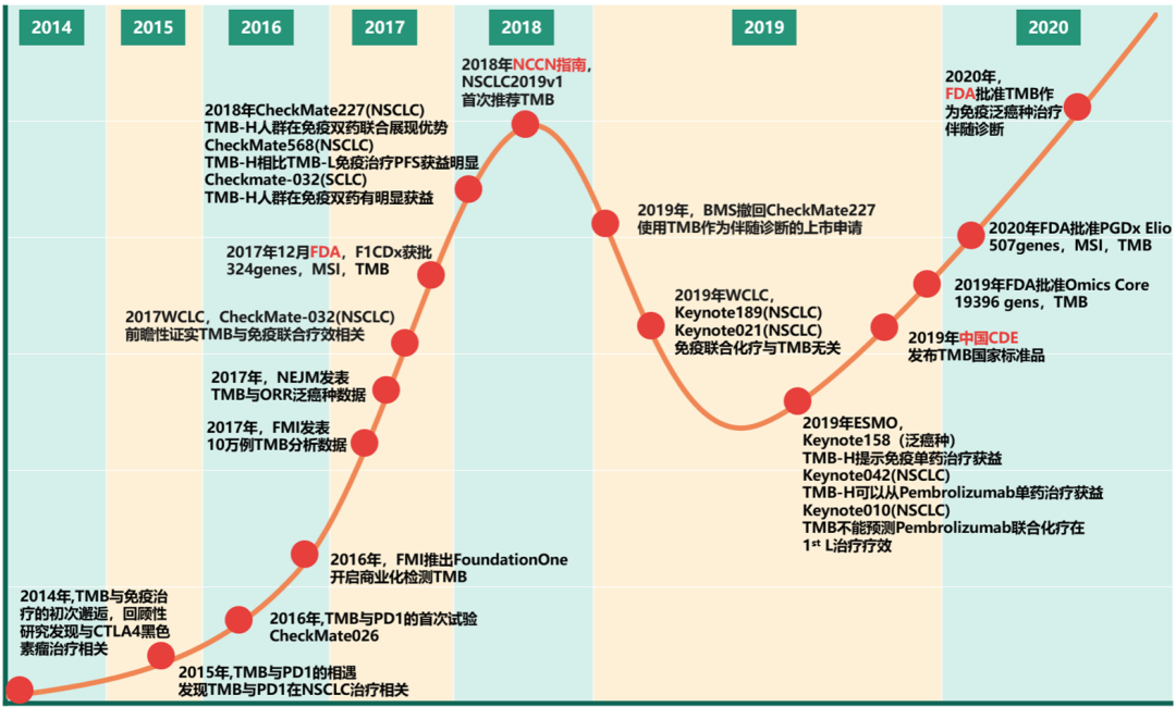 事实上,TMB作为肿瘤免疫治疗标志物从2014年进入临床研究人员视野,在与免疫治疗邂逅之后,就开始了一段坎坷的“人生旅程”,期间可谓跌宕起伏,时至今日获得FDA伴随诊断批准后,才终于取得了关键的里程碑式胜利。下面,就让我们回顾一下TMB作为肿瘤免疫治疗伴随诊断的获批之路。
