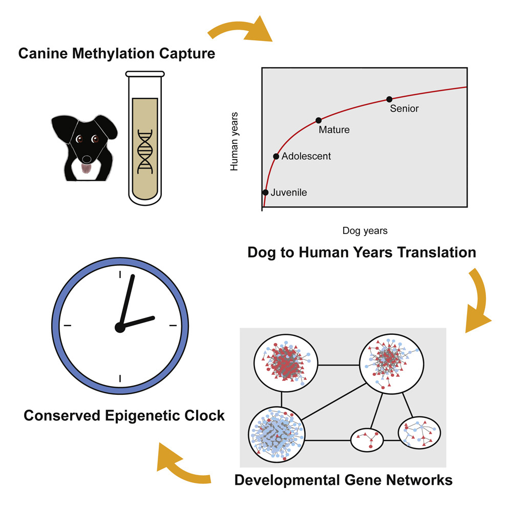 所有的哺乳动物,无论是狗、人还是其他任何生物,都经历着相似的生命周期,包括胚胎发育、出生、婴儿、青春期、成熟和衰老。发育和衰老在不同物种中是以不同速率发生的保守过程。近年来,科学家发现衰老过程中的关键分子改变是DNA甲基化组的重塑。研究已经发现数以万计的CpG甲基化状态会随着时间的变化而发生可预测的变化,进而能够构建称为“表观遗传钟”的数学模型,利用这些模型来准确地检测个体的年龄。但尚不清楚随着年龄增长发生的主要表观遗传变化是否涉及不同物种中相同或不同(甚至随机)的CpG位点。