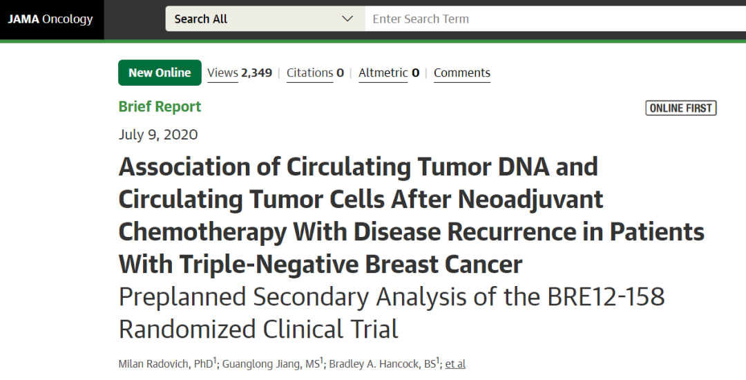近日,由美国印第安纳大学梅尔文布伦西蒙癌症中心研究人员领导的联合团队于JAMA Oncology杂志在线发表了BRE12-158研究预设二次分析报告,探讨了早期TNBC患者术前新辅助化疗后ctDNA和CTCs与复发和生存结局是否独立相关。BRE12-158是一项II期随机对照临床试验,旨在评估基因检测指导的治疗策略是否能够改善早期TNBC患者术前化疗后的生存预后。最新分析报告表明,将ctDNA测序和CTCs计数结合起来的新方法可以检测出女性TNBC患者在新辅助化疗后的残留病变,并预测疾病的复发。
