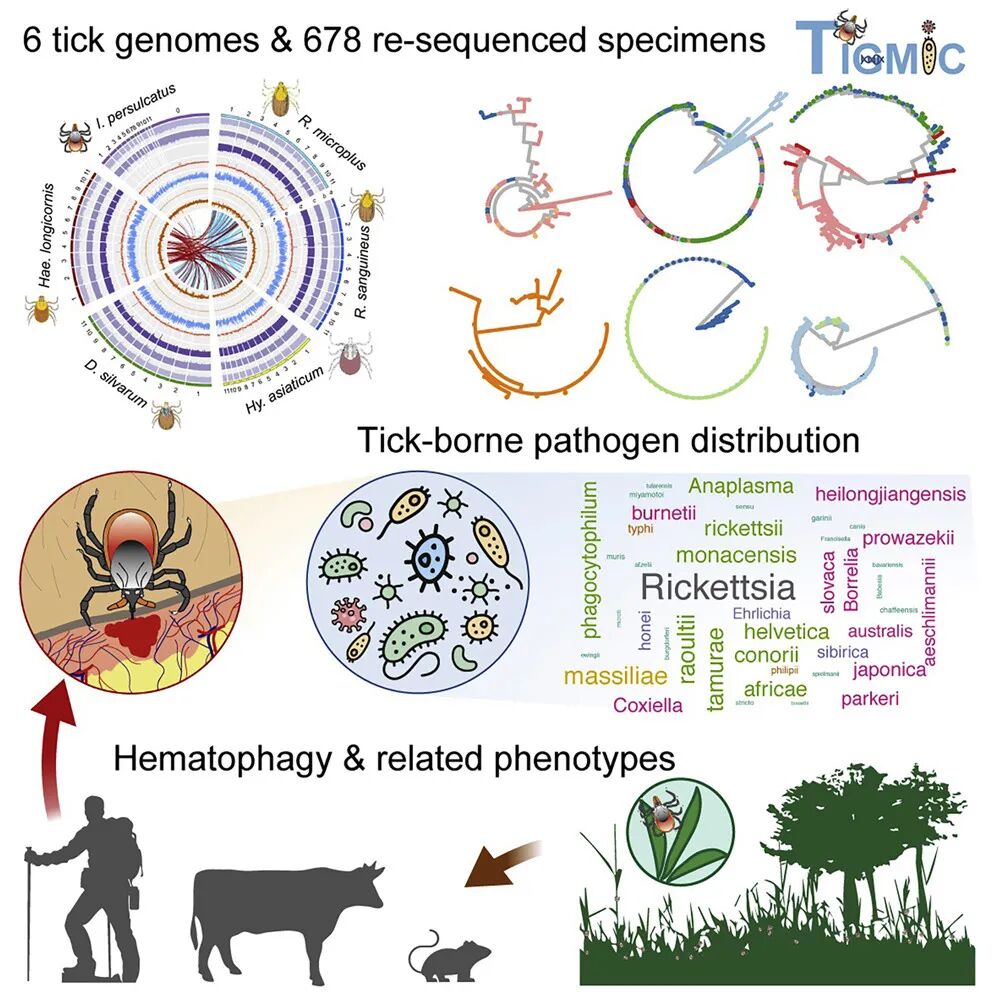 军事科学院军事医学研究院微生物流行病研究所曹务春团队与中国科学院北京生命科学研究院赵方庆团队合作,首次报道了我国6大广布蜱种的高质量基因组,包括全沟硬蜱(Ixodes persulcatus)、长角血蜱(Haemaphysalis longicornis)、森林革蜱(Dermacentor silvarum)、亚洲璃眼蜱(Hyalomma asiaticum)、血红扇头蜱(Rhipicephalus sanguineus)和微小扇头蜱(Rhipicephalus microplus),并首次阐明了6大蜱种的基因组多样性、群体遗传结构,以及病原体分布特点。该研究是掌握蜱遗传生物特性及其传播蜱媒传染病规律等方面的重大突破。北京时间8月18日晚间,相关成果以“Large-scale comparative analyses of tick genomes elucidate their genetic diversity and vector capacities”为题发表于《细胞》(Cell)杂志。