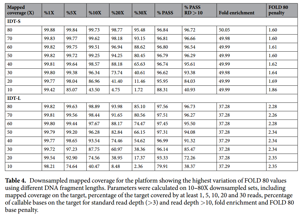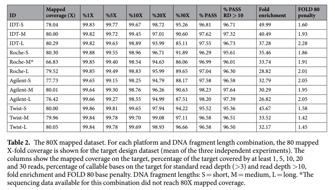 表2. 80X匹配率统计。对于每种平台和DNA片段长度组合,目标设计数据集的80X映射覆盖率。来源:Scientific Reports