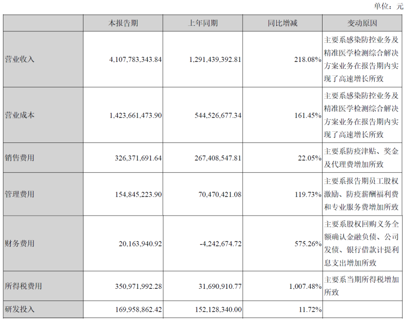 华大基因2020年上半年营业收入41.08亿元,同比增长218.08%;营业成本14.24亿元,同比增长161.45%。据报告解释,营收和成本的大幅增加主要系感染防控业务及精准医学检测综合解决方案业务在报告期内实现了高速增长所致。销售费用3.26亿元,同比增长22.05%,费用增长主要用于防疫津贴、奖金及代理费增加。