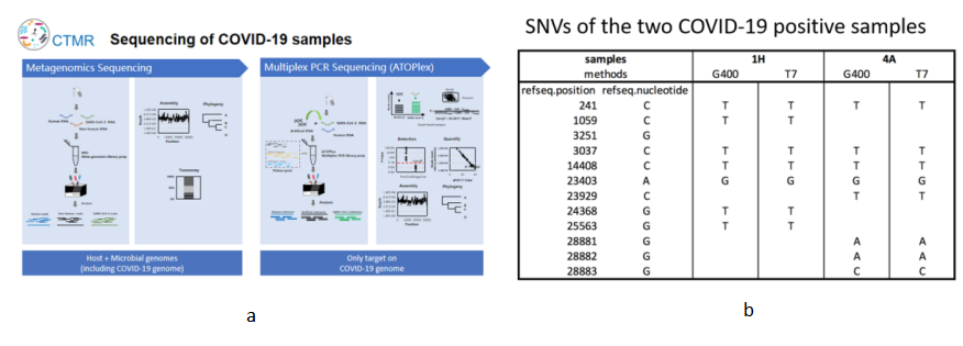 图1. a)瑞典卡罗林斯卡医学院转化微生物组研究中心的新冠病毒测序流程;b)基于DNBSEQ平台对新冠肺炎阳性样本的SNV检测结果。