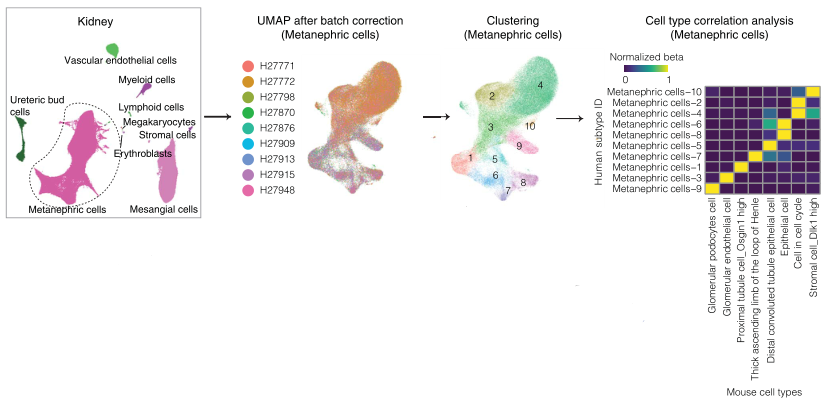 研究人员还从未解剖的胚胎中提取了200万个细胞,并将这些人类胎儿数据与小鼠器官发生细胞图谱(MOCA)整合起来。通过交叉匹配初步注释,发现小鼠细胞的分布与MOCA的整体分析相似。尽管物种不同,但许多人类细胞亚型与小鼠细胞类型匹配达到了1:1。例如,人类肾脏中的多种上皮细胞亚型与注释的MCA细胞类型匹配为1:1。