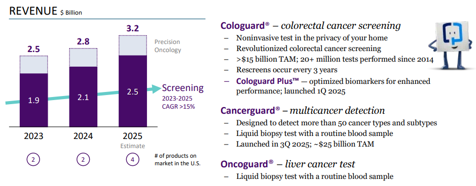 作为癌症筛查与精准肿瘤学诊断领域的领军企业,Exact Sciences主要通过基于粪便的检测、液体活检技术(血液检测)、分子残留病灶监测服务,以及治疗建议与治疗方案选择,为患者在癌症诊断前、诊断期间及诊断后提供全方位的支持。据官网显示,Exact Sciences打造了覆盖“早筛、诊断、监测”全周期产品体系,目前可提供结直肠癌筛查检测Cologuard、Cologuard Plus,多癌早期检测(MCED)Cancerguard,肝癌检测Oncoguard,癌症遗传风险检测Riskguard,乳腺癌复发监测和治疗选择检测Oncotype DX,以及最小残留疾病(MRD)检测Oncodetect,指导晚期、转移性或复发性实体瘤治疗的检测OncoExTra。