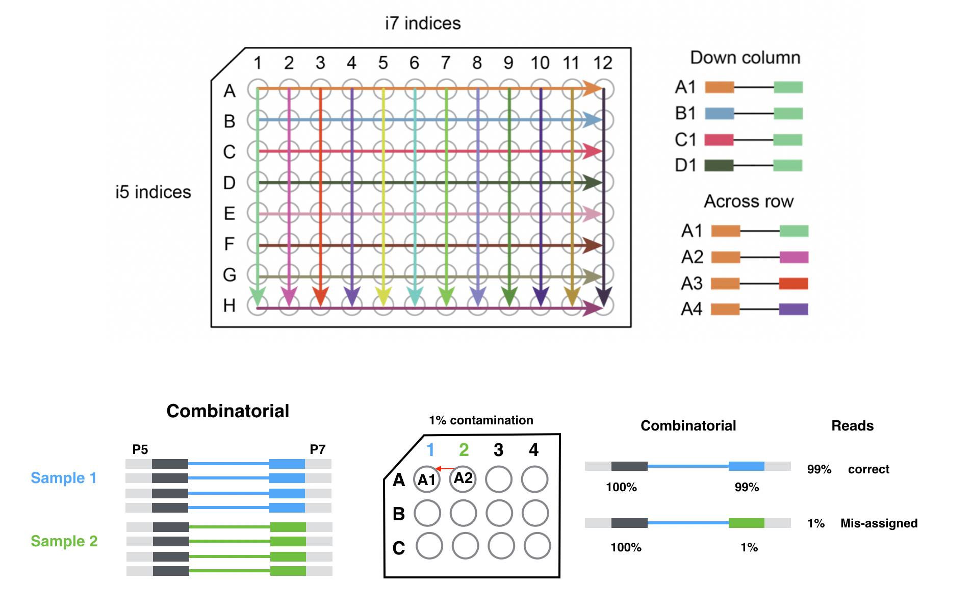 例如,传统双端index的方法是通过少数几种index序列(8+12,共计20种)排列组合(combination)实现96种样品的标签区分。然而这种方式非常容易在加样过程中引入index交叉污染。我们假设实验过程中由于操作失误或者污染,A1中混入了1%的 A2号index,混入后组成新的i7 、i5 组合index。而该种组合在样品分配中无法将这部分错误剔除(由于A1A2 混合在一起进行测序,任何i5,i7的组合都是“合法”的)。因此原本属于A1标签的样本中的1%的测序数据就被错误的分配到A2标签的另一个样本中。