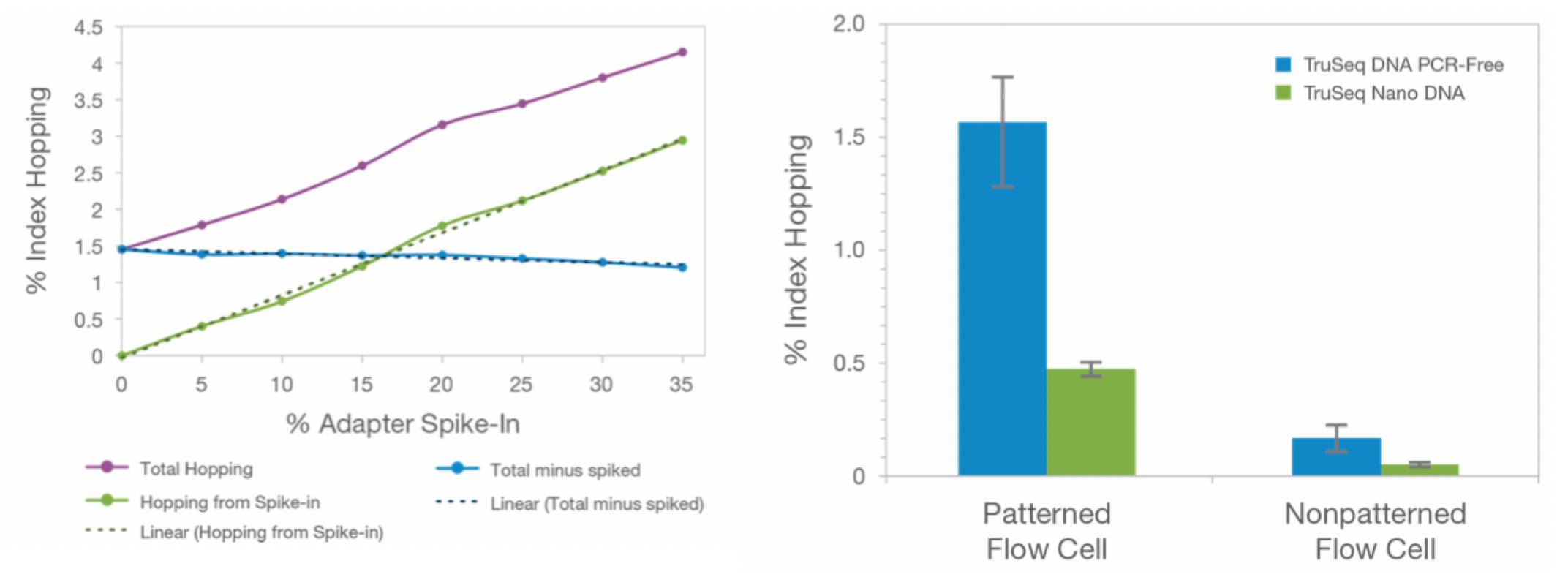 ExAmp(Exclusion Amplification), 这种技术搭配patterned flow cell使用,大大提升了测序效率,降低了测序成本。但是illumina也观察到,与传统的桥式扩增(bridge amplification)相比,也引起了更多的样本错配。illumina还观察到,标签跳跃的程度和 spike in 的接头比例成正相关;相比在传统桥式扩增平台,在ExAmp方式下,标签跳跃的比例可高达达到2% [2]。