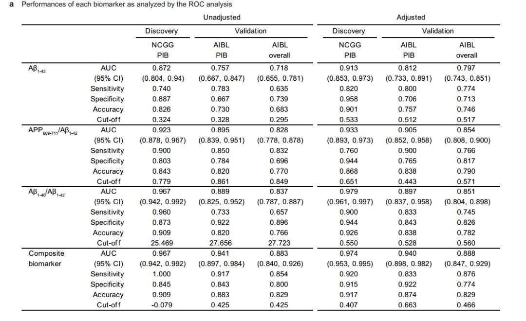 进一步的研究结果则证实了这些生物标志物的靠谱程度!在第一个数据库中,其AUC值(评估模型的优劣程度)高达96.7%;而在第二个数据库中,总体AUC值也有88.3%。值得一提的是,在第二个数据库中,有111名个体已经通过正电子发射断层扫描(PET)接受了诊断,可以纳为标准参考。在这个亚群里,这项研究带来的AUC值为94.1%。综合灵敏度和特异性来看,该检测方法的准确率(考虑真阳性和真阴性)最高超过了90%。