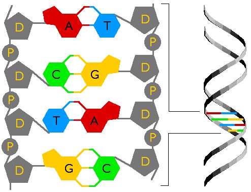 A——腺嘌呤;T——胸腺嘧啶;C——胞嘧啶;G——鸟瞟呤;根据碱基互补配对原则,A与T配对、C与G配对。(图片来源:网络)