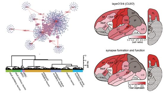 此外,该研究还系统分析了已知的自闭症风险基因在各个脑区兴奋性神经元中的表达特点和区域特异性,推测了胚胎发育时期对自闭症发生最密切相关的脑区以及潜在的风险基因,为研究神经系统疾病的发生机理提供了参考。