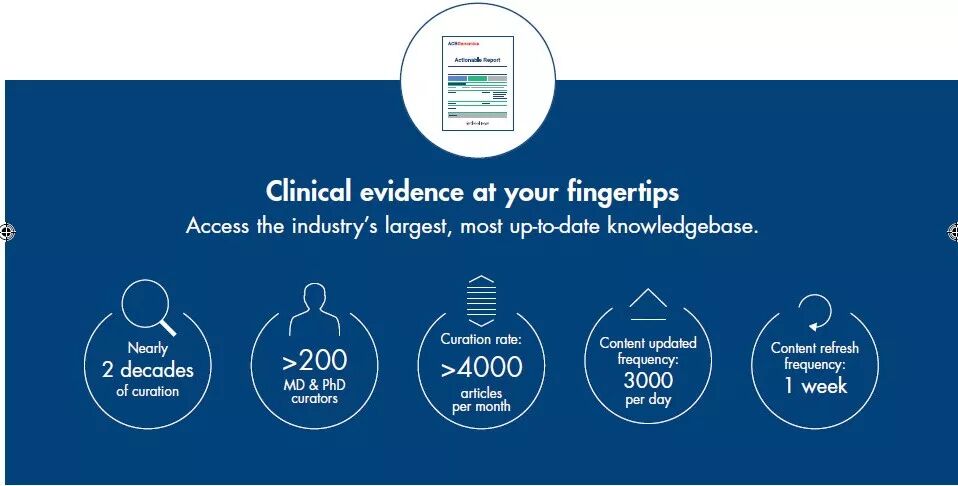 QKB中包含了>20,000中疾病类型、>8,000种药物、>13,000条人工矫正的变异、药物和疾病关系的条目,其中有>1400条条目与NSCLC相关。同时在美国和欧洲每个月平均有1~3个药物被审批、250个癌症相关的clinical trial开始并且有140个癌症相关的clinical trial停止招募,所以QCI-I会每周进行FDA/EMA药物label和Clinical Trial的更新,在分析报告中提供最新的用药和临床实验信息。