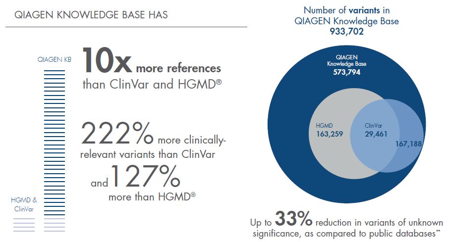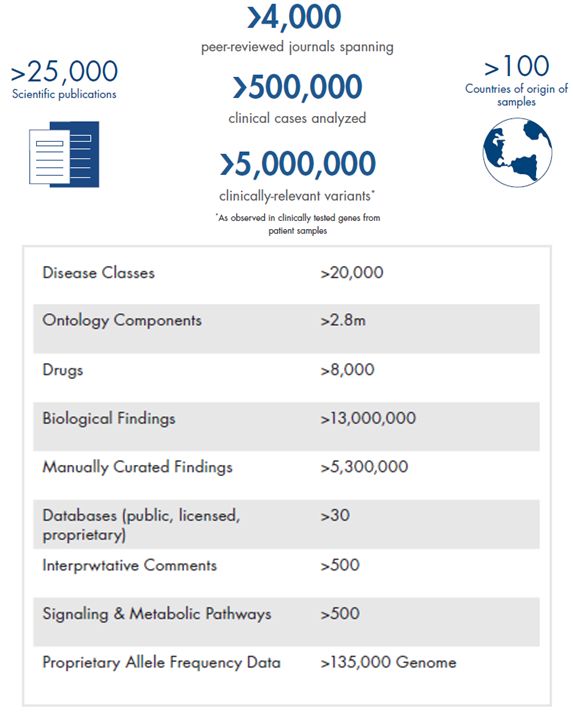据了解,QCI-I决策系统背后基于QIAGEN Knowledge Base(QKB)数据库,该数据库整合了QIAGEN 2014年收购的遗传病变异位点金标准数据库HGMD、变异位点用药数据库PGMD、2013年收购的Ingenuity Knowledge Base 数据库、临床诊断的罕见病变异位点数据库CentoMD(目前包含17万例罕见病患者)以及第三方的数据库包括COSMIC、OMIM、ClinVar、1000genome、Allele Frequency Community等。QKB总共包含了>13 Million findings、18,029个基因、933,702个变异位点、>300,000 curated articles、跨越了>4,000种同行审议的杂志、分析样本数>500,000、文章引用率>25,000篇。这些完善的数据库信息,尤其是人工矫正的文献信息,为触发ACMG-AMP、ASCO/AMP/CAP指南中的co-segregation、de novo status、co-occurrence、functional study criteria 提供了充足的信息,而这些是公共数据库信息很难提供的。