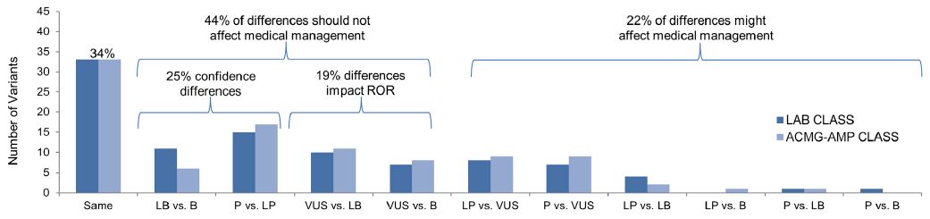 虽然目前行业内已经拥有了标准的ACMG-AMP行业指南,但是研究者通过评估美国9个顶级实验室采用ACMG-AMP指南对99个变异位点的分级结果后发现,评级的一致性只有34%;另外有44%是不一致的,但是不会影响用药或治疗;剩下的22%解读结果截然相反,会影响患者的用药或治疗。评级结果之所以有如此大的差异,主要在于支持变异位点的文献、数据库信息是否充分或正确。
