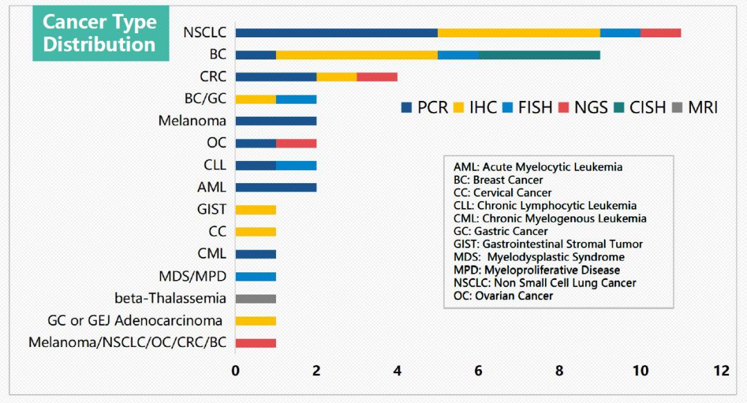 CDx目前最主要的应用是在肿瘤治疗领域,仅有一项是获批在地中海贫血症的治疗中。肿瘤领域CDx以非小细胞肺癌(NSCLC)、乳腺癌(BC)、结直肠癌(CRC)中获批最多,这也是肿瘤靶向治疗应用比较多的的三大癌种。5种CDx分子诊断技术在各癌种中均有分布,NSCLC和BC中分别有4种技术同台竞技。目前NGS技术在NSCLC、BC、CRC、OC(卵巢癌)、Melanoma(黑色素瘤)五种癌种中均有获批,虽不是覆盖癌种最多的技术,但在近2年的时间内能在多个癌种全面铺开,并与使用近20年的“金标准”技术方法作比对,仍能在检测限等方面显示处明显优势,可谓前途可期。