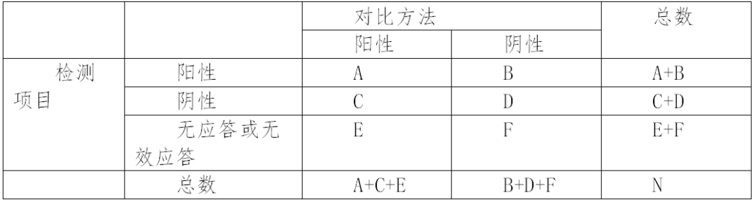 表2注:准确性研究中无应答或无效应答的百分比应该被估计为(E + F)/ N以及95%的双侧置信区间。此外,应评价阴性结果中的无呼叫或无效呼叫E /(A + C + E)和阳性结果中的无呼叫或无效呼叫F /(B + D + F)。申请人应设定无应答或无效应答的最小可接受标准并提供依据。样本总数(N = A + B + C + D + E + F)。申请人应对没应答或无效应答产生原因进行分析,注意区分无呼叫或无效结果与模棱两可结果,如质控正常但结果无法识别的情况等。