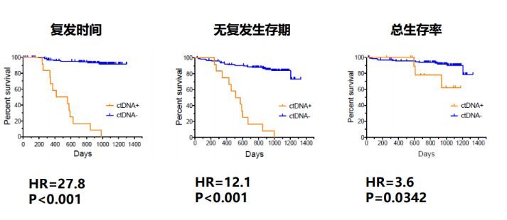 一项采用AVENIO ctDNA监测试剂盒对145例II/III期R0切除术后结直肠癌(CRC)患者的微小残留病灶(MRD)进行定性检测,根据术后血浆中ctDNA检测结果将患者分为ctDNA阳性和ctDNA阴性。研究发现,术后ctDNA阳性患者在复发时间、无复发生存期及总生存率上均显著短于ctDNA阴性患者(如图3),证明MRD检测可识别II/III期CRC高复发风险人群。对于高复发风险的患者可考虑更为积极的辅助治疗,并增加随访,以期改善预后。