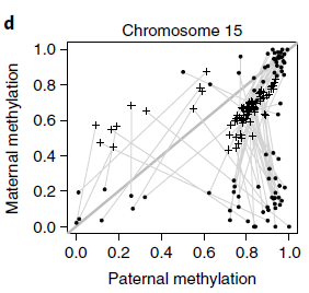 父本基因组的甲基化会在受精后迅速消失,在胚泡阶段也会完成去甲基化[2][3][4] ,但是亲本差异甲基化区域不会消失,如图3。尽管配子中存在很强的甲基化差异,但大部分的PWS/AS亲本甲基化位点是在体细胞建立的。