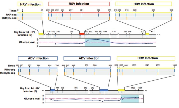 该研究监测一位54岁男性志愿者共1124天(监测期间共经历6次病毒感染,2次血糖浓度升高),记录了其各时间点的健康参数,并基于PBMCs获得57组RNA-seq数据,28组MethyIC-seq数据。